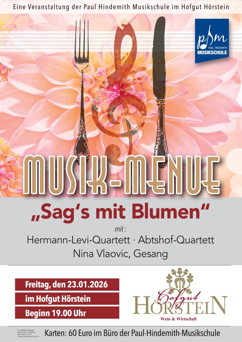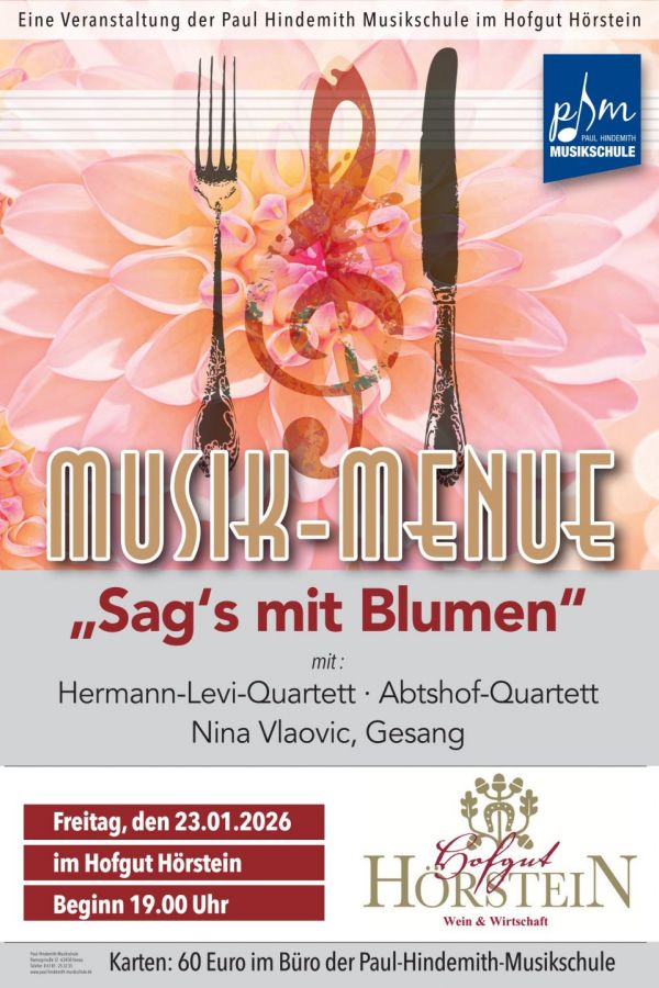 …man könnte auch sagen „vielen Dank für die Blumen“: wie auch immer, das Hofgut-Menü-Konzert der Paul-Hindemith-Musikschule Hanau am Freitag, 23. Januar 2026 um 19 Uhr wird richtig „blumig“. Begleiten Sie uns in den bunten Garten Eden voller prächtig leuchtender Blüten und erhabenen Gewächsen der Klassik und Moderne, die natürlich auch die zwischenmenschlichen Verwurzelungen in den Beeten beleuchten. Dargeboten in drei liebevoll gestalteten Musik-Sträußen von dem „Herman-Levi-Quartett“, dem „Abtshof-Quartett“ und der Sängerin Nina Vlaovic. Genießen Sie dazu drei Weine mit fein-duften den Aromen passend ausgesucht zu einem Drei-Gang-Menü, verfeinert mit zarten Kräutern und gartenfrischen Zutaten. Karten zum Preis von 60,00 Euro incl. Menü und drei Weinen gibt es ab 18. November ausschließlich in unserem Büro in der Ramsaystraße 12. Reservierungen können ab sofort getätigt werden: