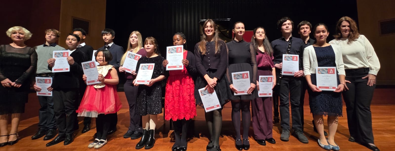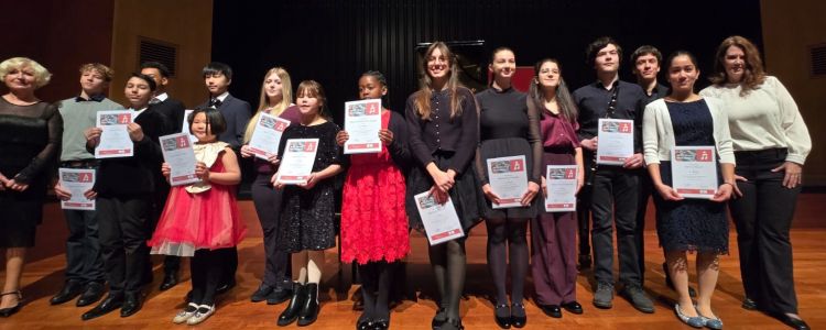Stolze Schülerinnen und Schüler, stolze Klavier-Pädagoginnen: Insgesamt 14 Preisträgerinnen und Preisträger konnte die Paul-Hindemith-Musikschule Hanau (PHM) beim diesjährigen Willy-Bissing-Wettbewerb Hanau stellen. Eine wahrlich beachtenswerte Leistung, die die Teilnehmerinnen und Teilnehmer entweder auf dem solistischen Feld oder im Ensemblespiel mit großem Erfolg erreichen konnten. Für Julia Kohlberger (rechts) und Renate Kapala hatte sich die intensive Vorbereitungsphase an den Tasten im besten Sinne bezahlt gemacht. So gab es aus der Klavierklasse Kohlberger einen ersten Preis für Helena Khodaverdi und Laurin Egold in der Gruppe 2, Kammermusik, weiter einen ersten Preis für Sehrezad Dietrich und Alexandra Schwarz in der Gruppe 2, vierhändig. Sienna Münch und Lukas Bender belegten einen ersten Preis in der Gruppe fünf und sechs, beide schon mehrfach auch in anderen Wettbewerben sehr erfolgreich unterwegs. Aus der Klavierklasse Kapala konnten sich Lucy Chen, Sofia Herrmann, Felix Zhou jeweils über einen ersten Preis freuen. Eliora Simo Tagne und Adam Koch konnten sich als Zweitplatzierte behaupten. Ebenfalls mit einem zweiten Preis wurde Daria Ustinov aus der Klavierklasse von Weiran Zhang bedacht. Der Willy-Bissing-Wettbewerb – benannt nach dem berühmten Hanauer Pianisten und Beethoven-Interpreten Willy Bissing wird alljährlich gefördert und ausgerichtet von der Sparkasse Hanau. Wir gratulieren allen Teilnehmenden sehr herzlich zu ihrem großartigen Erfolg verbunden mit einem großen Dank an die PHM-Dozentinnen für die fruchtbare Arbeit im Vorfeld.